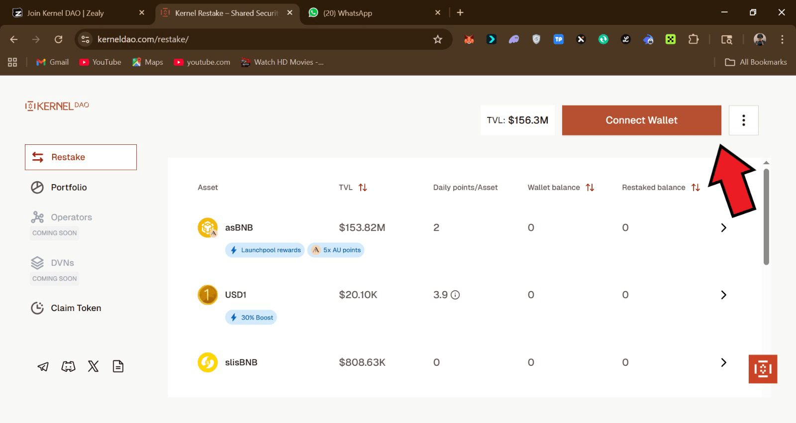 Öffnen Sie die offizielle KernelDAO-App → klicken Sie auf „Wallet verbinden“ → wählen Sie MetaMask, Trust Wallet usw.