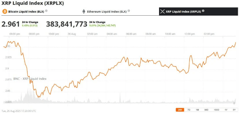 XRP wurde bei etwa 2,96 $ gehandelt, was einem Anstieg von 0,45 % in den letzten 24 Stunden zum Zeitpunkt der Presse entspricht. Quelle: XRP Liquid Index (XRPLX) über Brave New Coin