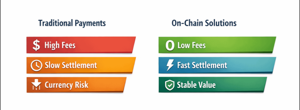 High settlement fees. Delays that stretch for days. Currency exposure that silently erodes margins. Every transaction leaks value. Not once. Every day.