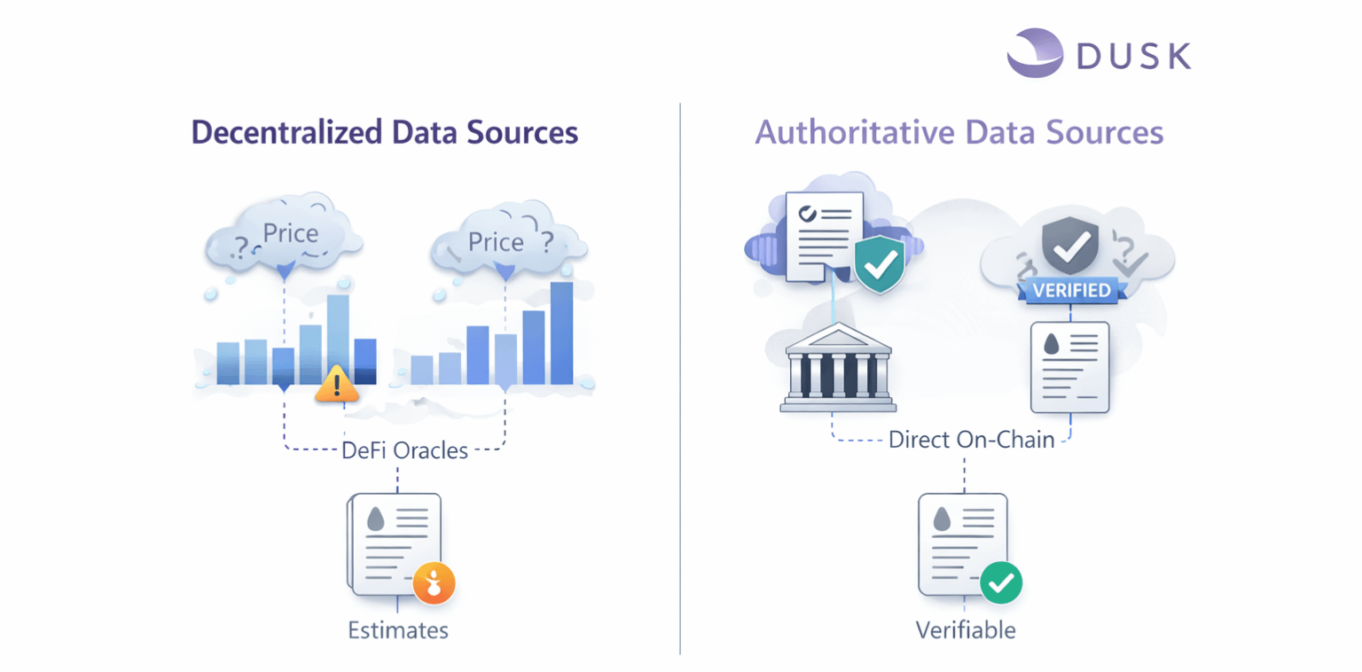 Die meisten Blockchains haben uns gelehrt, dass Dezentralisierung darum geht, Berechnung und Speicherung zu verteilen, und das funktioniert für Token, NFTs und lose strukturierte DeFi-Märkte. Aber die institutionelle Finanzwelt bricht nicht aufgrund von Rechenlimits zusammen, sondern aufgrund von Datenintegrität in regulierten Märkten. Preis ist nicht nur Information, er ist Beweis. Er muss beweisbar, prüfbar und rechtlich verteidigbar sein. Von der Gemeinschaft gesammelte Oracle-Preise, die in DeFi akzeptabel erscheinen, werden gefährlich, wenn das Asset eine Anleihe, ein Wertpapier oder ein regulierter Fonds ist. Dies ist die Lücke, auf die Dusk leise und absichtlich fokussiert ist. Anstatt Marktdaten als optionale Ergänzung zu behandeln, betrachtet Dusk offizielle Finanzdaten als zentrale Infrastruktur.