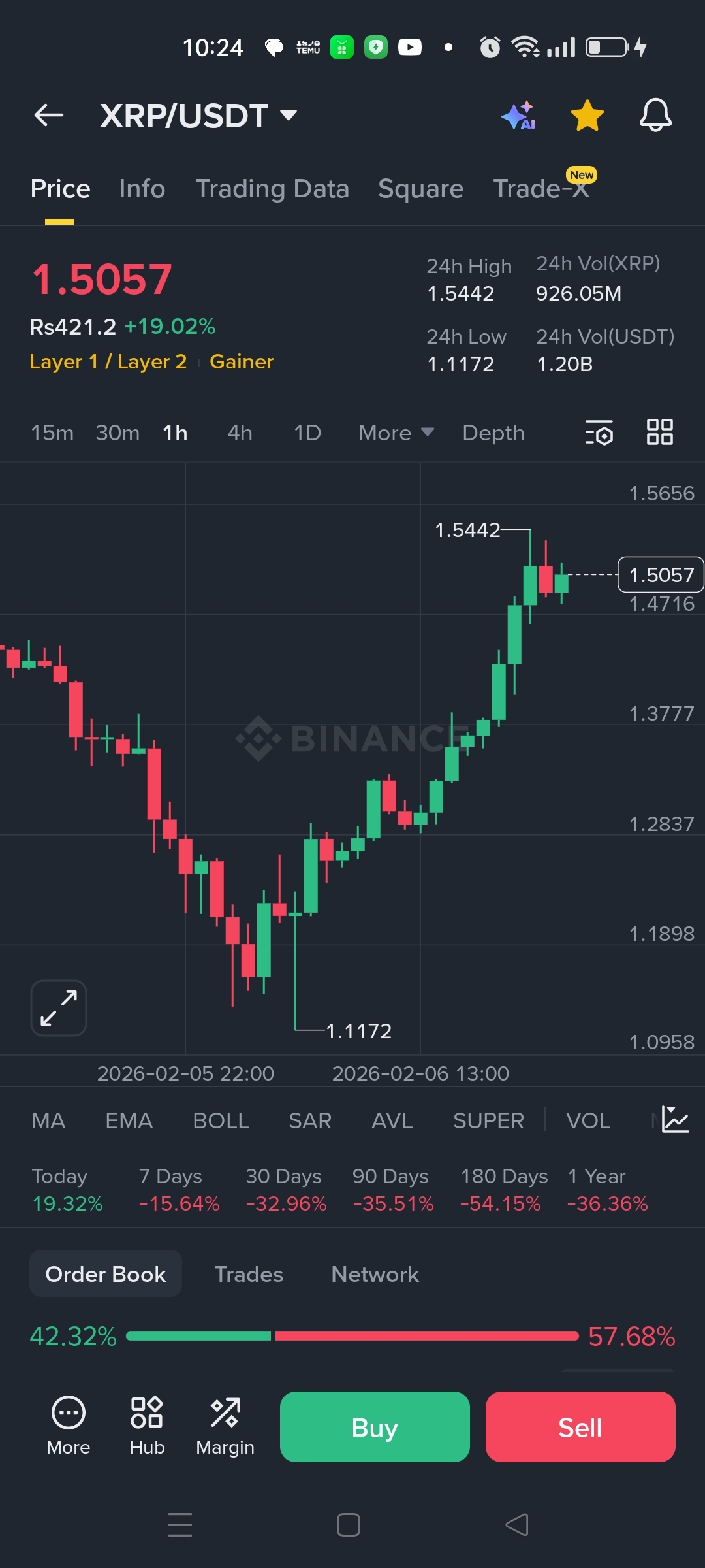 $XRP just pulled off one of the most impressive V-shaped recoveries we've seen in weeks. After bottoming out at $1.1172, it's now trading at $1.5057 — that's a massive +19.02% surge in just 24 hours!