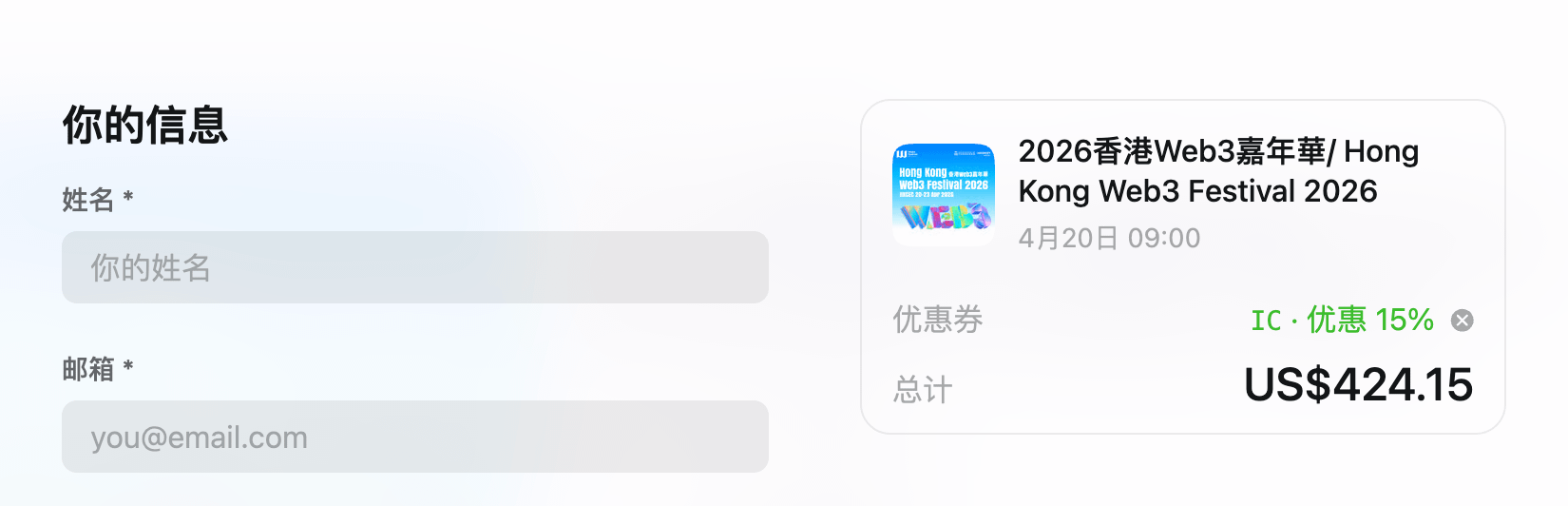 作为 2026 香港 Web3 嘉年华的官方社区合作伙伴,IC 中文社区为大家提供 85 折专属门票优惠,优惠码:IC。