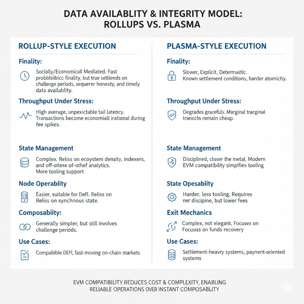 When people talk about Plasma today, especially in the context of EVM compatibility, it’s often framed as a technical revival story. I don’t see it that way. For me, it’s a response to operational friction that hasn’t gone away, even as tooling has improved. EVM compatibility doesn’t magically make Plasma better than rollups or other L2s. What it changes is the cost and complexity profile of execution, and that matters once you stop thinking in terms of benchmarks and start thinking in terms of settlement behavior under stress.