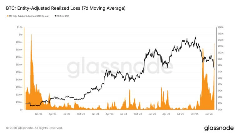 Glassnode-Daten zeigten, dass am 4. Februar die Entity-Adjusted Realized Loss von Bitcoin (7D-SMA) 889 Millionen Dollar pro Tag erreichte, der höchste tägliche Verlustrealisation seit November 2022.