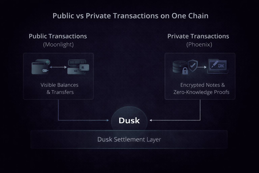Dusk unterstützt zwei Möglichkeiten, Vermögenswerte zu bewegen. Eine ist vollständig transparent, bei der Salden und Übertragungen sichtbar sind. Die andere ist vollständig privat, bei der Transaktionsdetails mithilfe von Kryptografie verborgen sind.