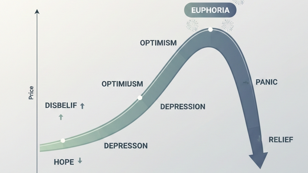 Die Psychologie eines Marktzyklus erklärt, warum Menschen zu spät kaufen, zu früh verkaufen und die gleichen Fehler in jedem Bullen- und Bärenmarkt wiederholen.