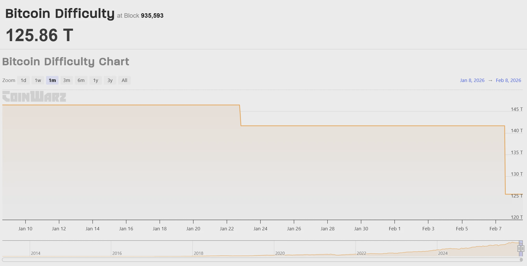 O tempo médio de bloqueio atualmente é de 9,47 minutos, um pouco abaixo da meta de 10 minutos. A CoinWarz estima que o próximo ajuste em 20 de fevereiro pode aumentar a dificuldade em aproximadamente 5,63%, para 132,96 T.