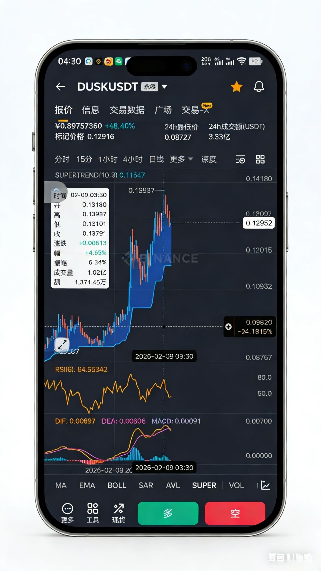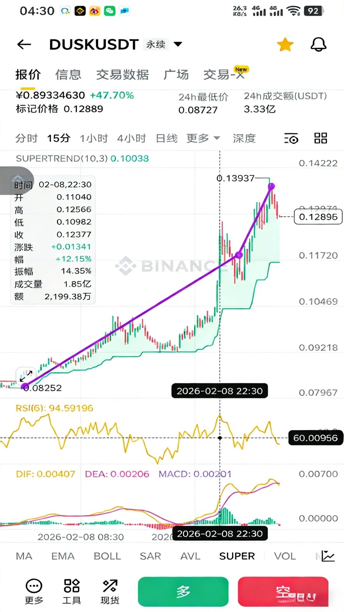 先看盘面,这三张图把Dusk的走势拆得明明白白。第一张图是2月8日凌晨01:15的15分钟K线,当时价格还在0.083附近徘徊,RSI(6)只有56.68,MACD刚翻红,一切都还波澜不惊,像是暴风雨前的宁静。到了第二张图,2月8日22:30,画风突变——价格直接冲破0.12,RSI飙升到94.59,进入严重超买区间,MACD红柱持续放大,成交量更是达到1.85亿,资金疯狂涌入,多头完全掌控了局面。第三张图是2月9日03:30,价格短暂回踩0.13后继续上攻,RSI虽然回落至84.55,但仍在高位,MACD保持金叉,说明多头力量还没完全耗尽,市场情绪依旧亢奋。
