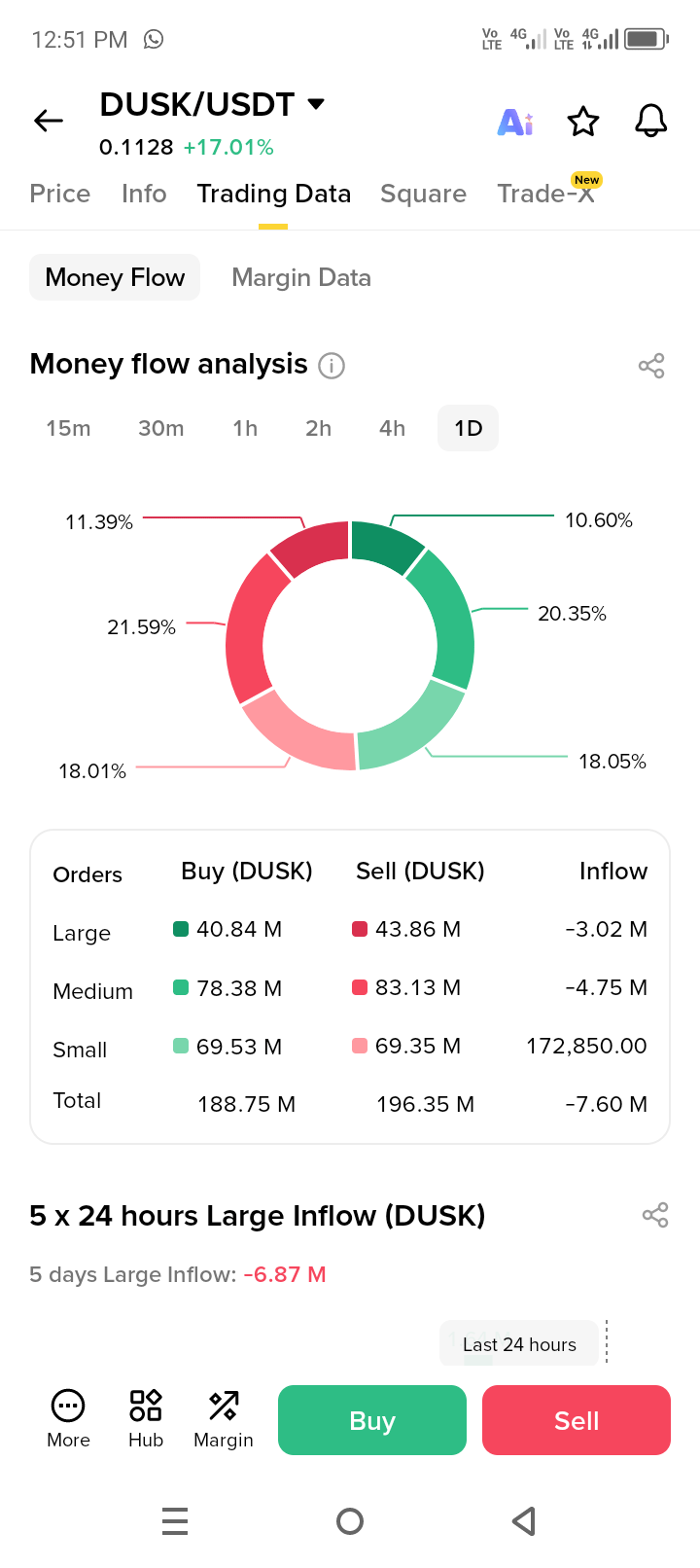 Over the past five days, large inflows have been negative at -6.87M DUSK, reinforcing the idea that institutional or large traders are reducing exposure.