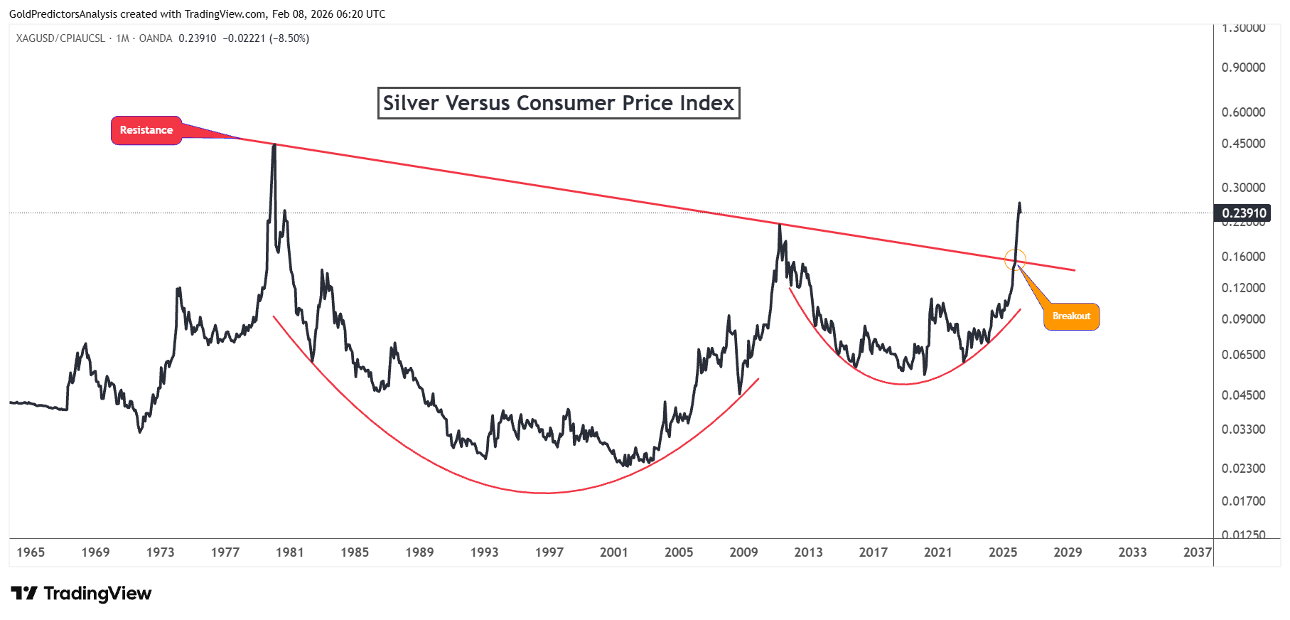 Das Diagramm unten zeigt, dass das Silber-CPI-Verhältnis einen massiven Ausbruch aus einem 40-jährigen Abwärtstrend zeigt. Silber hat ein Tassen- und Henkelmuster gebildet. Die Tasse wurde von 1980 bis 2011 gebildet, während der Henkel von 2011 bis 2025 gebildet wurde. Dieses Muster stellt eine Ansammlung über mehrere Jahrzehnte dar. Der Ausbruch im Jahr 2025 kam, nachdem Silber endlich die Widerstandslinie durchbrochen hatte, die die Preisverhältnisse seit 1980 begrenzte.