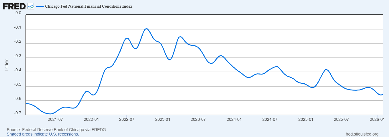 Das Diagramm unten zeigt, dass der Chicago Fed National Financial Conditions Index mit -0,557 locker ist. Allerdings verändert sich das Risikoverhalten.