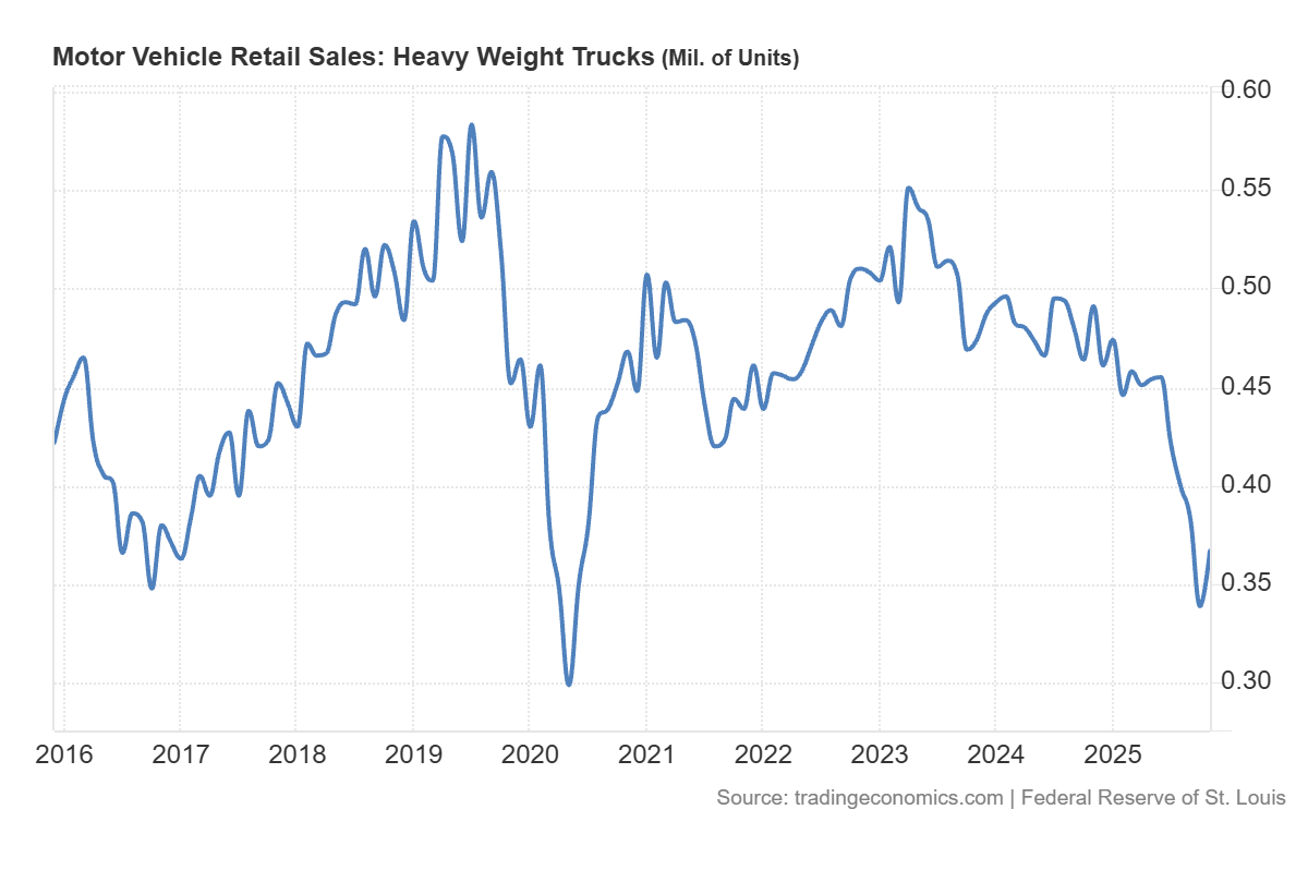 In der Zwischenzeit werden die Verkaufszahlen von schweren Lkw weiter untergraben. Der starke Rückgang in den letzten sechs Monaten zeigt, dass die tatsächliche Wirtschaft sich verlangsamt.