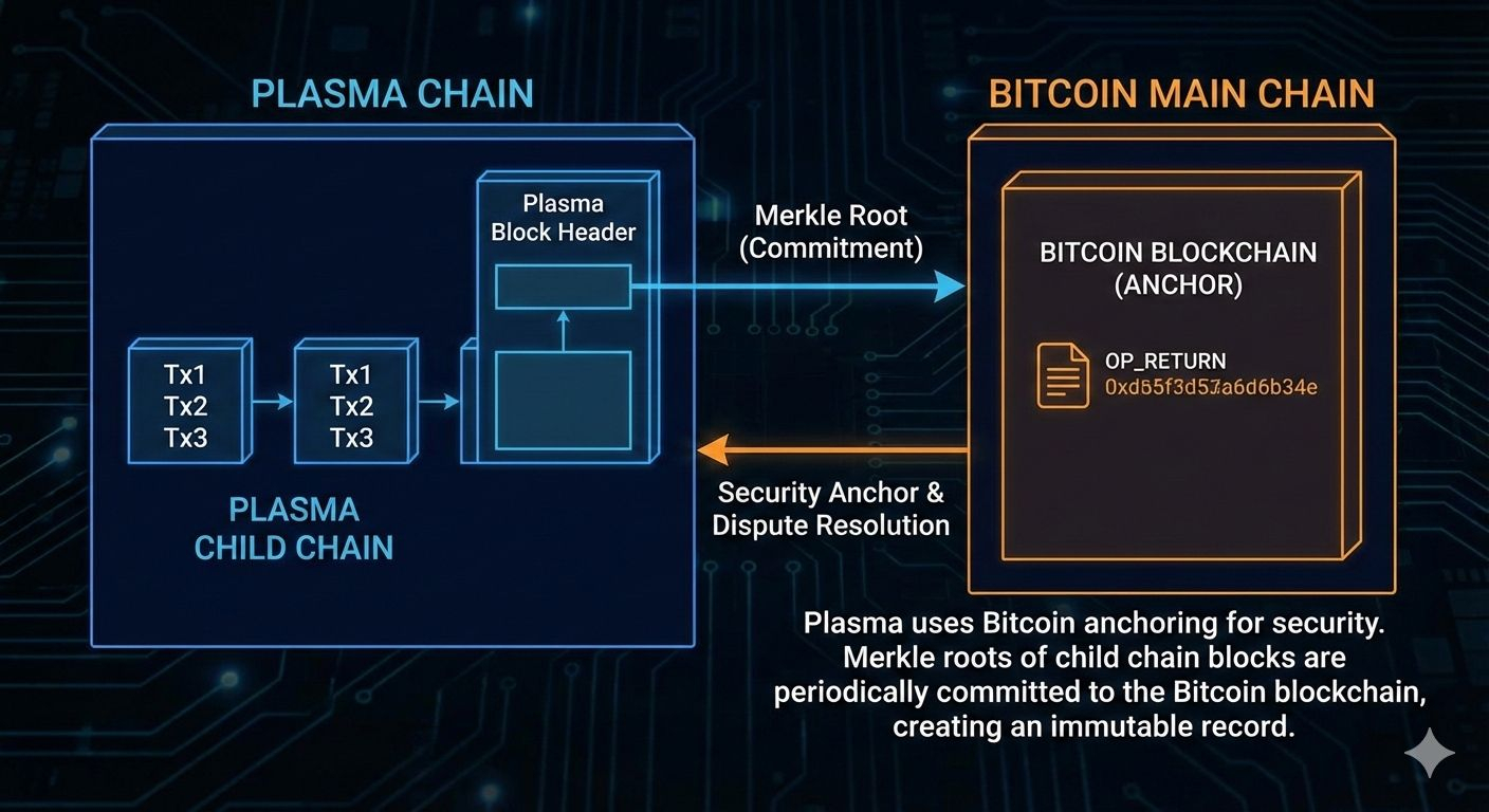 Bitcoin ist die sicherste Blockchain der Welt. Sie läuft seit Jahren, wird durch massive Rechenleistung geschützt und ist fast unmöglich zu ändern, sobald Daten darauf geschrieben sind. Plasma versucht nicht, mit Bitcoin zu konkurrieren. Stattdessen nutzt es Bitcoin als eine Art Sicherheitsverschluss.