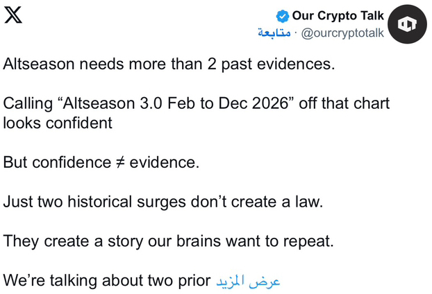 Die Idee der „Alternativen-Kryptowährungs-Saison 3.0“ erscheint überzeugend. Die Charts sind sauber. Und der Zeitrahmen ist vertraut. Aber Vertrauen bedeutet nicht Beweis. Wie das Konto Our Crypto Talk angemerkt hat, ist die Prognose einer Alternativen-Kryptowährungs-Saison im Jahr 2026 basierend auf nur zwei historischen Wellen statistisch schwach. Zwei Ereignisse schaffen eine Erzählung. Und schaffen kein Gesetz. Die Geschichte der Kryptowährungen ist kurz. Und strukturelle Veränderungen sind im Gange. Und die Annahme der einfachen Wiederholung scheitert oft.