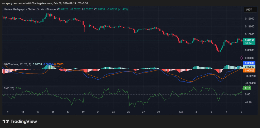 Das Diagramm für den Handel mit HBAR über einen Zeitraum von vier Stunden zeigt, dass der Preis steigen und den Widerstand bei 0,092 Dollar testen könnte. Weiterer Kaufdruck könnte ein goldenes Kreuzmuster erzeugen, das den Preis über das vorherige Hoch von 0,093 Dollar treiben könnte.
