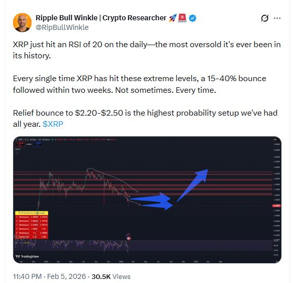Jedes Mal, wenn der RSI von XRP auf extrem niedrige Werte fällt, erwarten Analysten typischerweise einen Rückprall von 15-40%, während Käufer in den Markt eintreten.