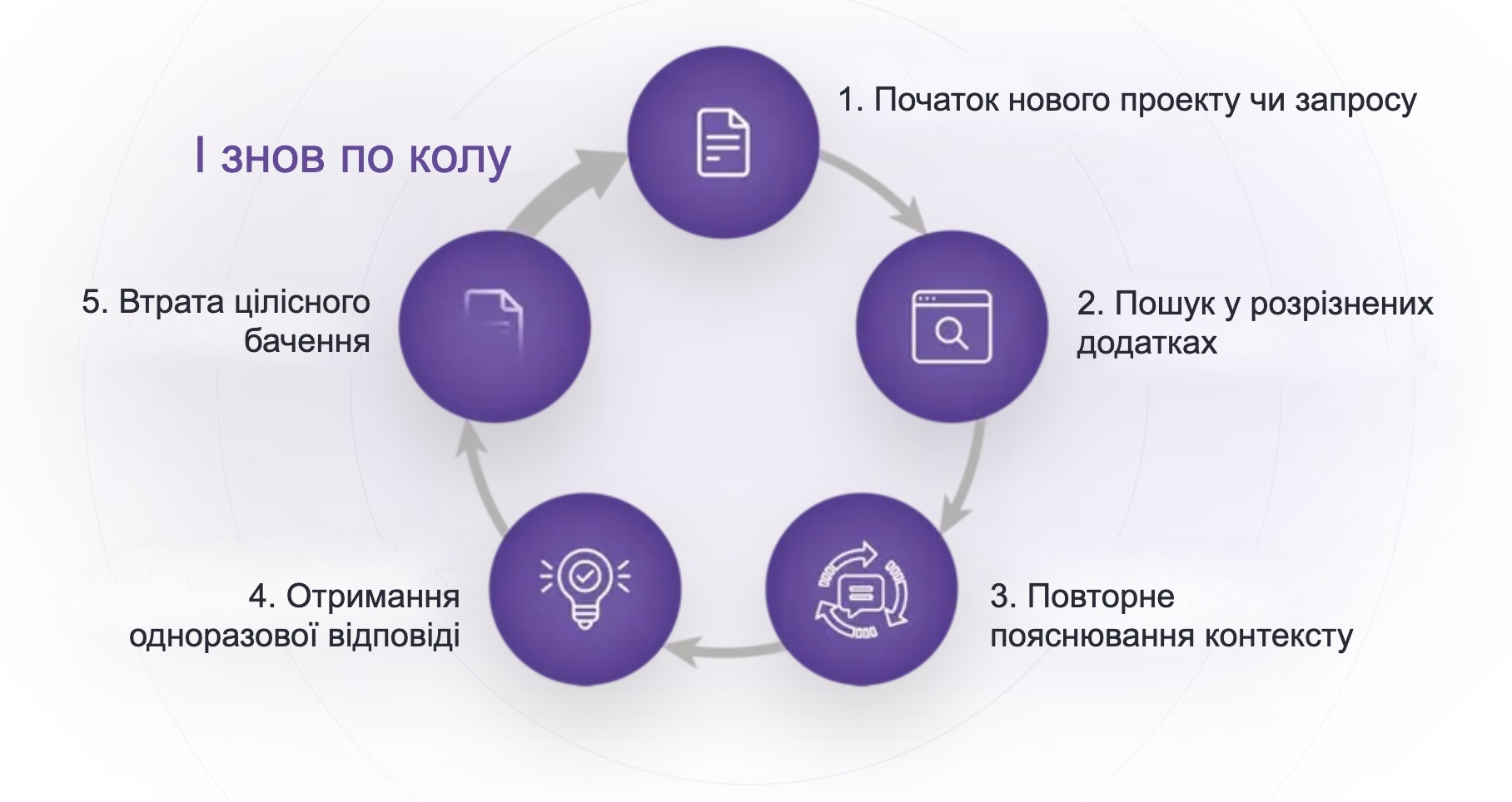 Кожен чат з ChatGPT, Claude чи Gemini - як нова зустріч. Контекст зникає після сесії. Документи, нотатки, попередні рішення - все треба пояснювати заново.