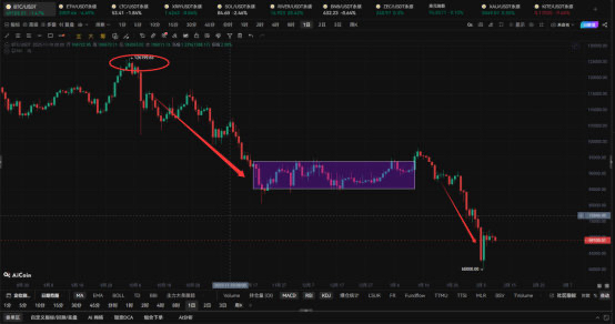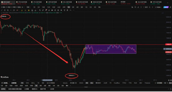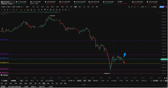 Jetzt schauen wir uns die Tageslinie an. Bitcoin ist von einem Höchststand von 12199.63 stetig gefallen und hat nach einer kurzen Pause im Bereich von 85000-95000 weiter nach unten gedreht, mit einem Tiefststand von 60000, von dem aus er eine Erholung zeigt. Derzeit liegt der Preis in der Nähe von 69000 und schwankt. Aus der Analyse geht hervor, dass weiterhin ein Abwärtsrisiko besteht. Anhand der oberen und unteren Schattenlinien können wir sehen, dass Bitcoin auf Tagesbasis im Bereich von 68000-72000 schwankt. Auf Stundenbasis wissen wir bereits, dass ein starker Durchbruch der Box-Formation erforderlich ist, bevor die tatsächliche Richtung kommt.