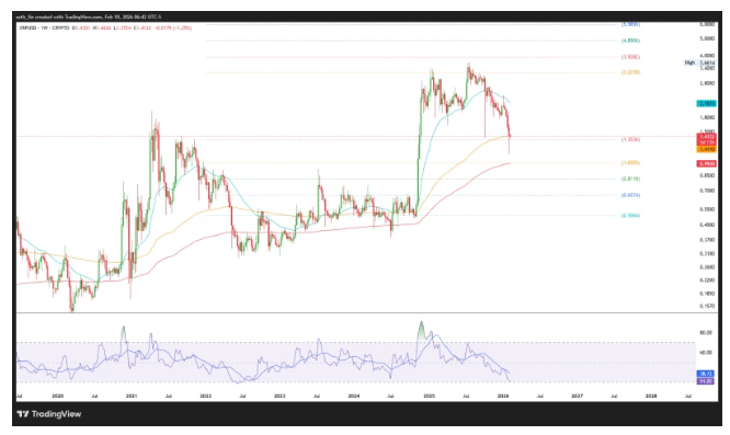 $XRP is testing a critical long-term support zone near the 200-week moving average, with price hovering around $1.30–$1.40. A clean hold could stabilize the trend, but a breakdown puts the psychological $1.00 level squarely in play.