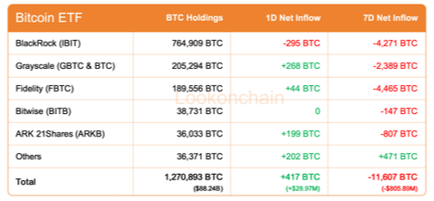 Dòng tiền trong ngày: Đang tăng trưởng dương +417 BTC tương đương +$28.97 Triệu USD.