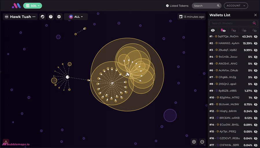 Im Dezember 2024 sagte ein Freund aufgeregt zu mir, dass er einen Meme-Coin namens HAWK gekauft habe, weil "der Influencer Haliey Welch es unterstützt". Ich sagte: "Warte, lass mich das mit Bubblemaps überprüfen." 30 Sekunden später erschien auf meinem Bildschirm ein erstaunliches Bild: Ein riesiger grüner Blasenkreis, der 80 % des Bildschirms einnahm, umgeben von unzähligen kleinen Blasen.