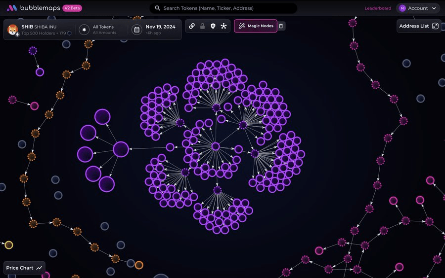 Das Blasendiagramm von SHIBA INU, aktiviert durch magische Knoten, zeigt versteckte Wallets, die das Cluster unterstützen. Diese Wallets erscheinen unabhängig, werden aber tatsächlich von demselben Unternehmen kontrolliert.