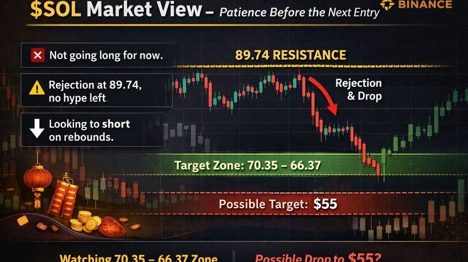 Die Ablehnung war stark, und der Rückgang folgte mit klarem Momentum. Im Moment bevorzuge ich es, nach Short-Gelegenheiten bei Rückschlägen zu suchen, anstatt Aufwärtsbewegungen hinterherzujagen. Seit dem Wochenende ist SOL im Bereich von 89–90 instabil, ohne starken Kaufdruck. Selbst positive Nachrichten von der Wall Street haben das Vertrauen in den Markt nicht wiederhergestellt.