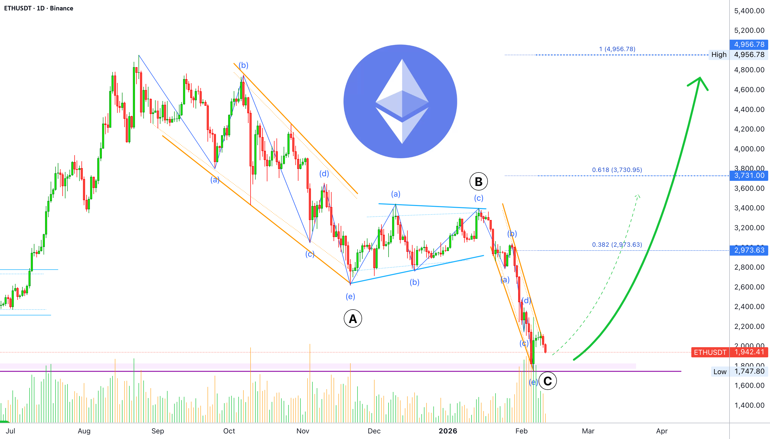 إنها مجرد تخمين، لكن يبدو أن الإيثريوم على وشك أن يؤدي إلى قاع أعلى مقارنة بنهاية موجة C. وهذا يعني أن موجة صاعدة ستأتي بعد ذلك. هذه قاع أعلى كلاسيكي. دعني أشرح.