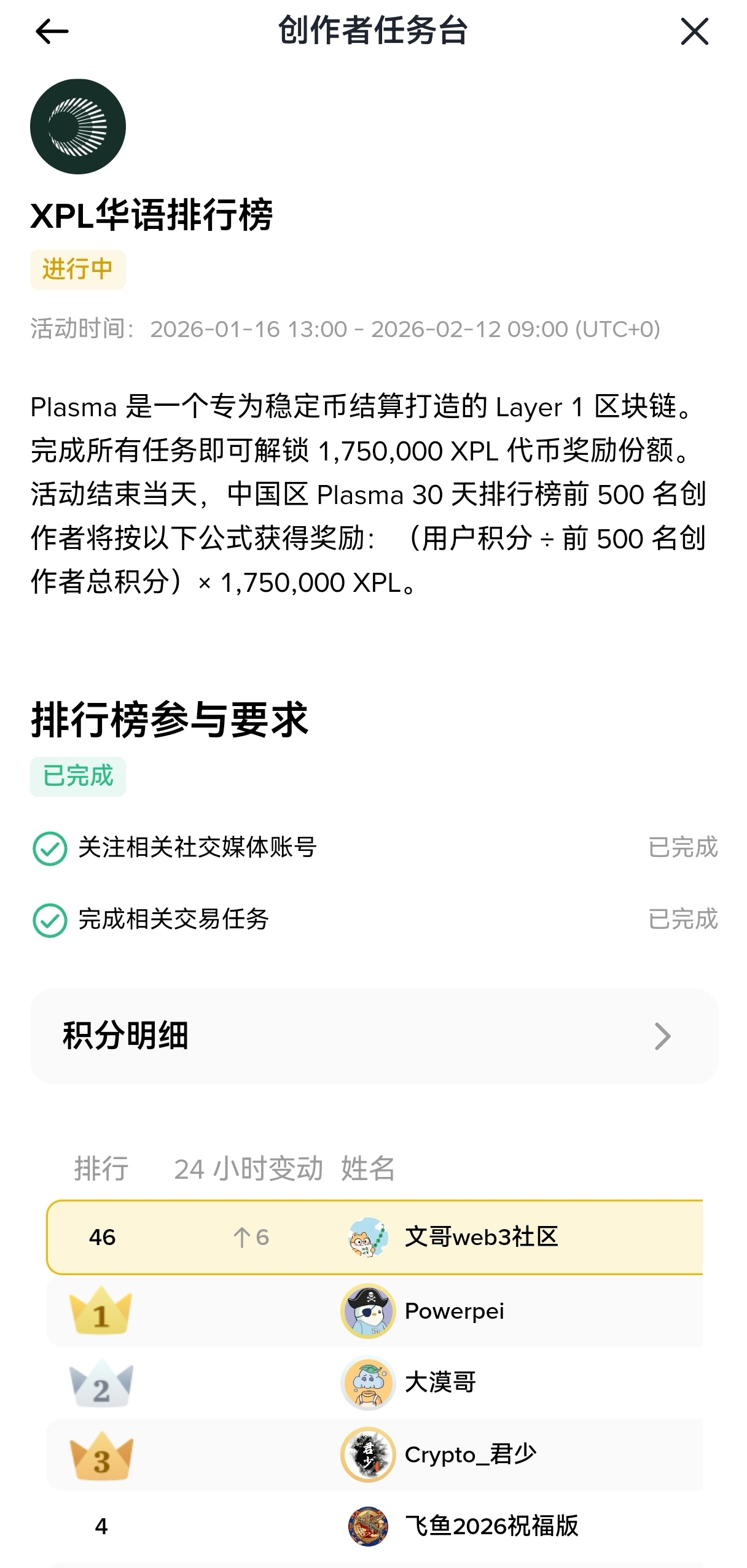 Zurück zum Thema, die Aktivität der Schöpfer von plasma läuft nur noch 8 Stunden, viele Partner haben hervorragende Ergebnisse erzielt. Obwohl mein Punktestand weniger als die Hälfte der ersten drei ist, bin ich schon sehr zufrieden, denn es kommt auf die Teilnahme an, und ich habe mein Bestes gegeben. In die Top 50 zu kommen, fühlt sich bereits über den Erwartungen an, schließlich ist es das erste Mal, dass ich an einem Ranking-Wettbewerb teilnehme.