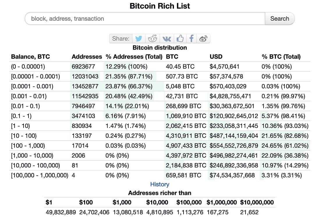 Weniger als 2 % der Bitcoin-Adressen halten eine volle Münze (unter 1 Million Menschen weltweit).