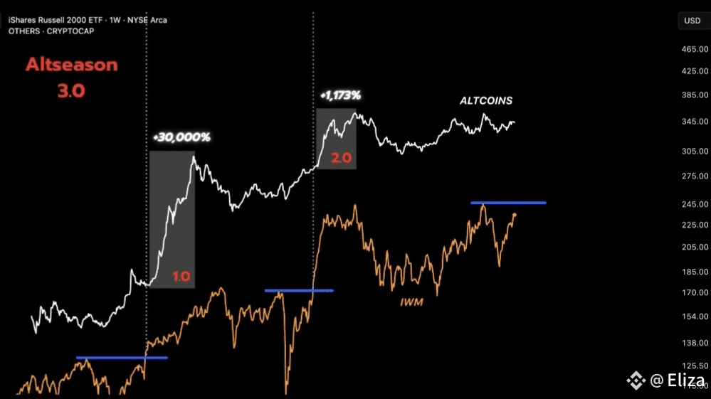 Diese Art von risikofreudiger Umgebung stoppt nicht nur bei Aktien. Historisch gesehen, wenn Small-Cap-Aktien an Schwung gewinnen, wirkt sich das auf andere hochriskante Märkte aus – und dazu gehört auch Krypto. Innerhalb der Krypto-Welt verhalten sich Altcoins oft wie die Small-Caps der digitalen Vermögenswerte. Sie bleiben zunächst zurück, laufen dann aber stärker an, sobald Vertrauen und Liquidität sich ausbreiten.