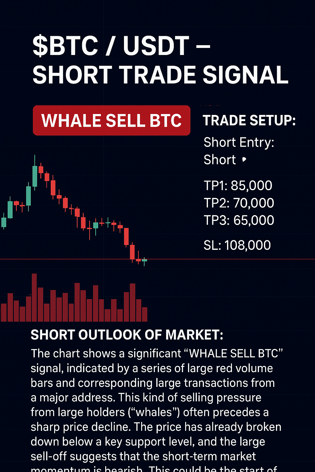 Das Diagramm zeigt ein „WHALE SELL $BTC BTC“-Signal 🐋💥. Es gibt eine Reihe von riesigen roten Volumenbalken und massiven Transaktionen von einer großen Adresse. Wenn Wale anfangen, so zu verkaufen, signalisiert das normalerweise, dass ein starker Preisverfall bevorsteht.
