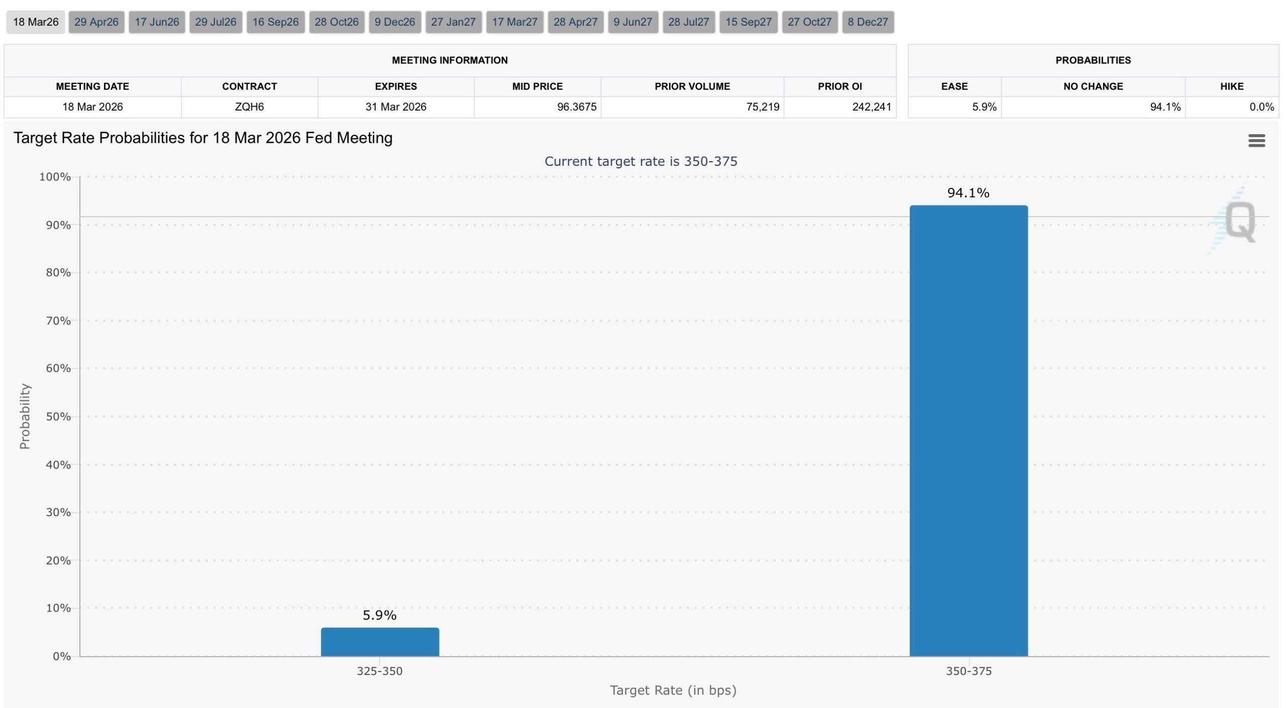 Daten vom CME FedWatch-Tool zeigen derzeit eine Wahrscheinlichkeit von fast 95%, dass die Fed die Zinsen in naher Zukunft unverändert bei 3,50%-3,75% belassen wird.