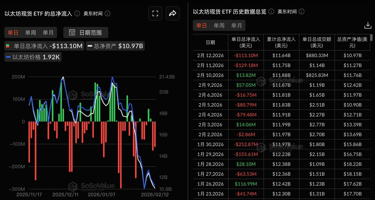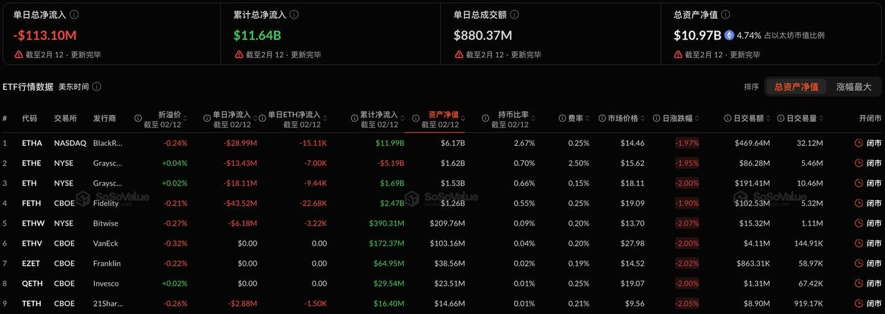 Laut SoSoValue-Daten betrug der Nettoabfluss des Ethereum Spot ETF am 12. Februar (Eastern Standard Time) 113 Millionen US-Dollar.