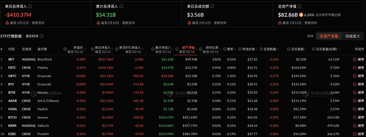 Laut SoSoValue-Daten betrug der Nettoabfluss des Bitcoin Spot ETF am 12. Februar (Eastern Standard Time) 410 Millionen US-Dollar.