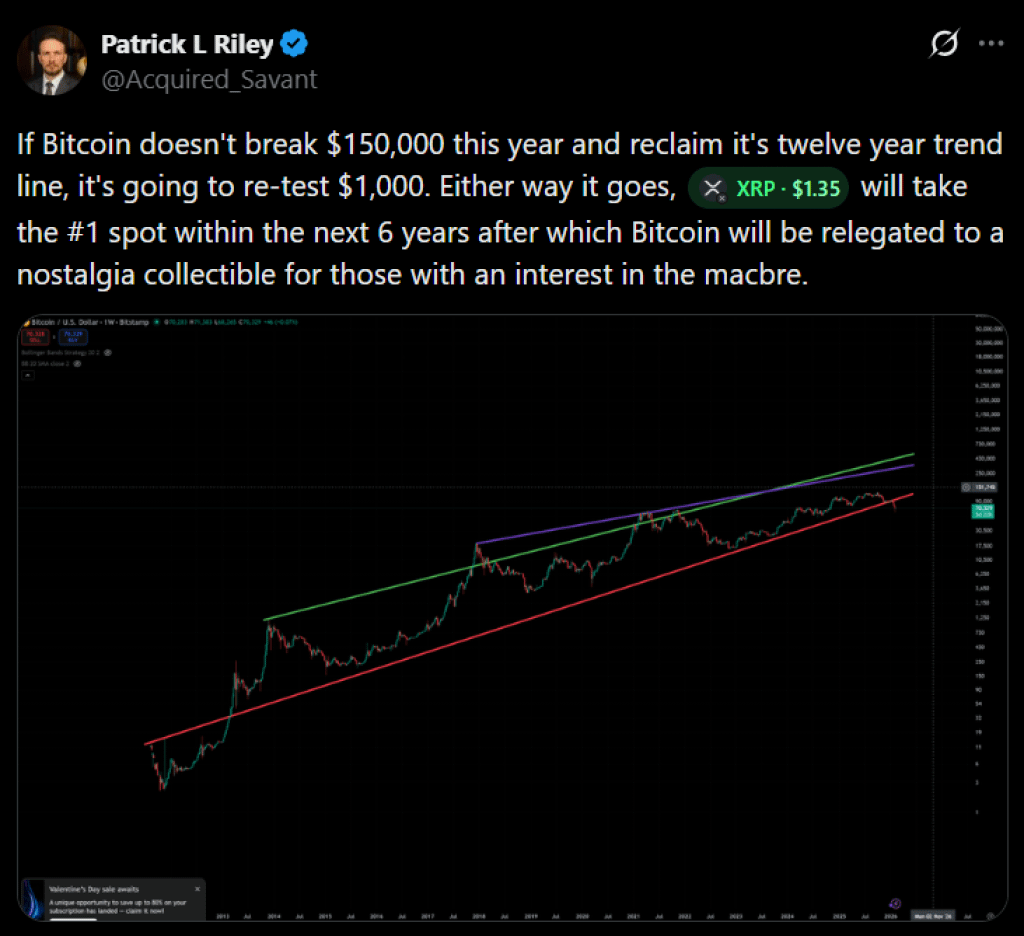 Ein kürzlich veröffentlichter Kommentar, der von TheCryptoBasic hervorgehoben wurde, konzentriert sich auf Patrick L. Riley, einen amerikanischen Veteranen und Unternehmer, der glaubt, dass XRP Bitcoin innerhalb von sechs Jahren übertreffen könnte. Riley präsentiert diesen Ausblick in einer Zeit, in der sowohl die Preisperformance von Bitcoin als auch von XRP weit unter früheren Höchstständen liegt, was die Prognose bemerkenswerter macht.