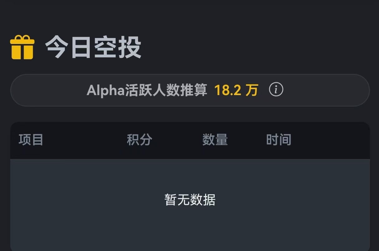 等了一天的空投,才发现等了个寂寞。目前市场已经进入熊市,项目很少,社区的活跃度也降到冰点。Alpha的日活持续降低,从半月前的20万到目前的18万,有很多小伙伴准备 “辞职”或选择低分保号。从昨天的Alpha空投ip门槛240分不到1分钟就被秒光,前天的alpha box也迅速被抢光可见一斑,小伙伴们在撤退。