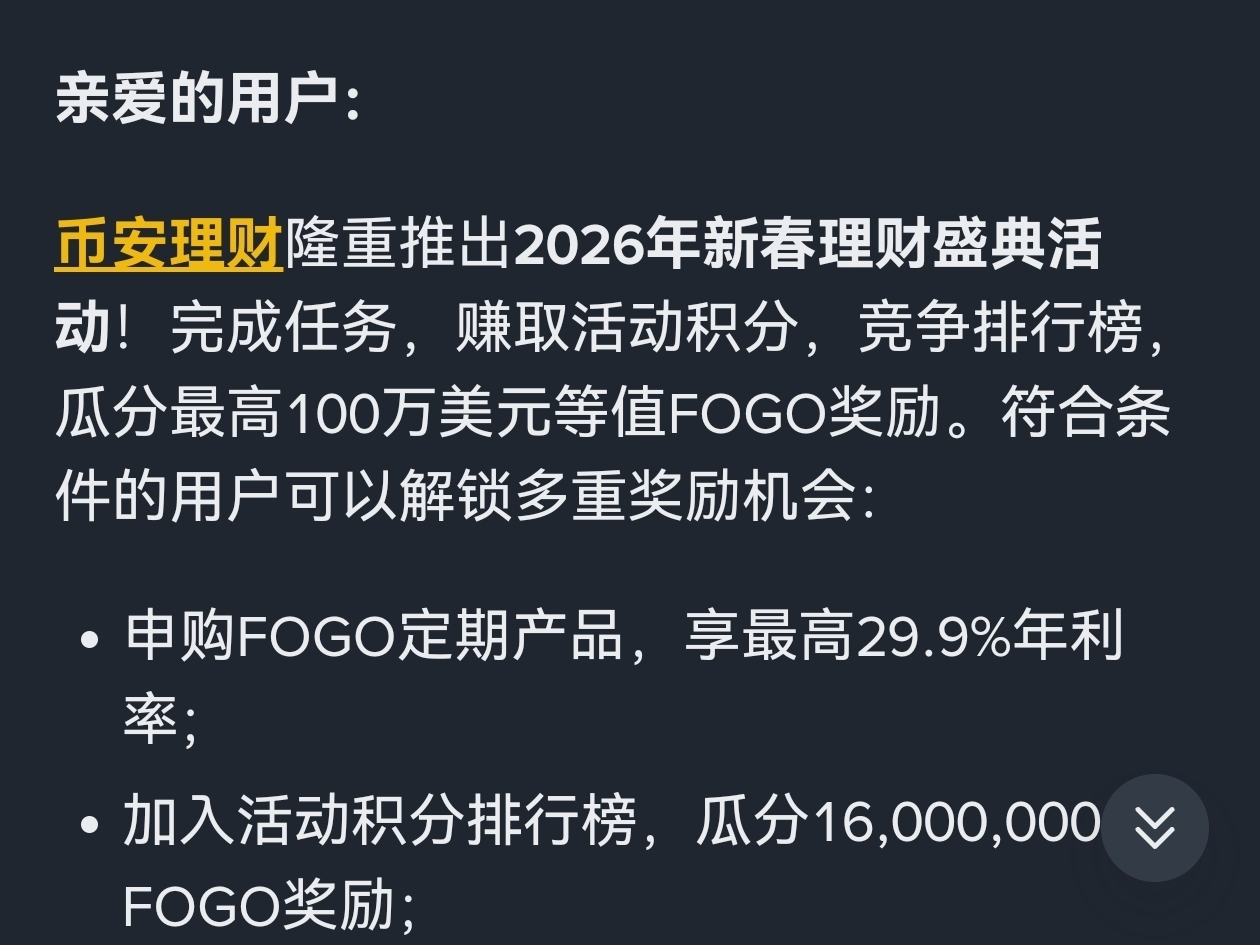 风险提醒:FOGO是新币,价格会波动大。理财有锁定期,币价跌了还是可能亏本。玩之前自己评估,建议直接看官方公告确认最新消息