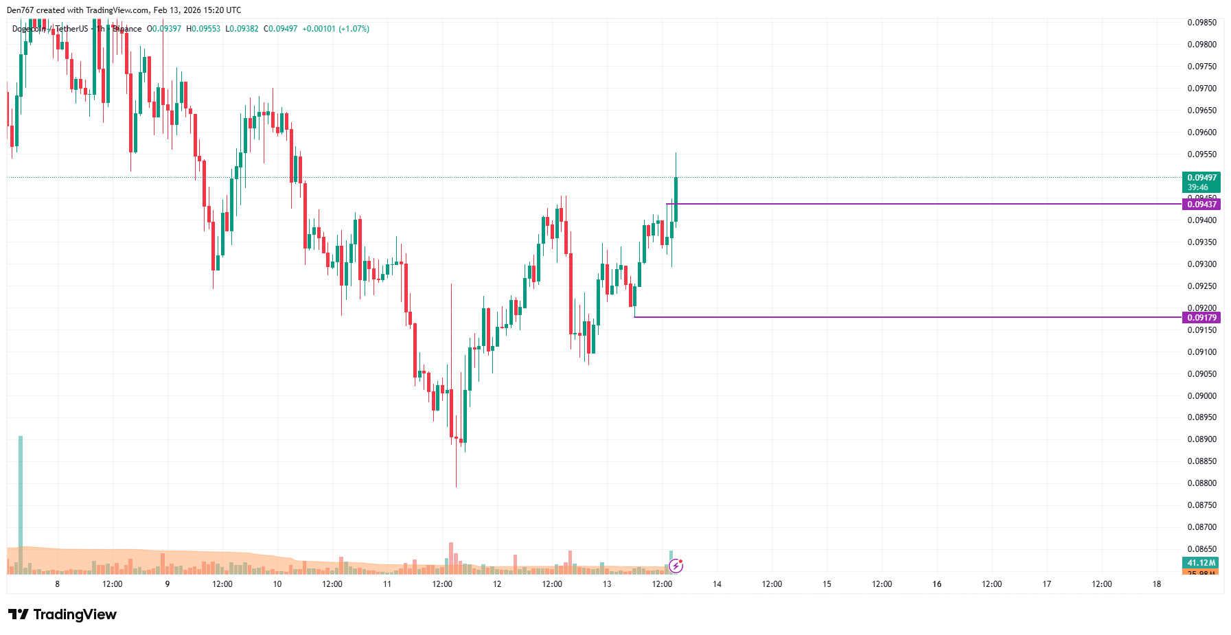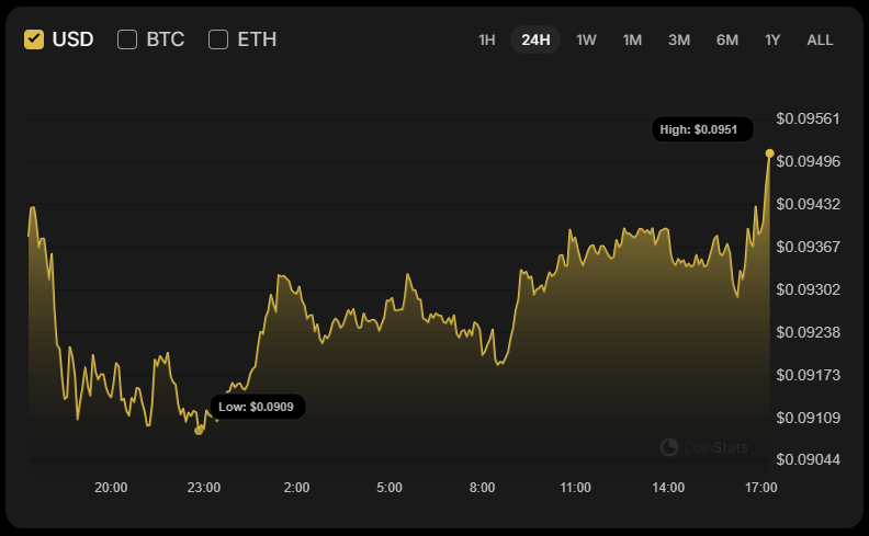 Im Stundenchart versucht der Kurs von DOGE, über dem lokalen Widerstand bei $0,09437 zu fixieren. Wenn dies geschieht, könnte das Wachstum zur Prüfung der $0,097-Zone morgen führen.