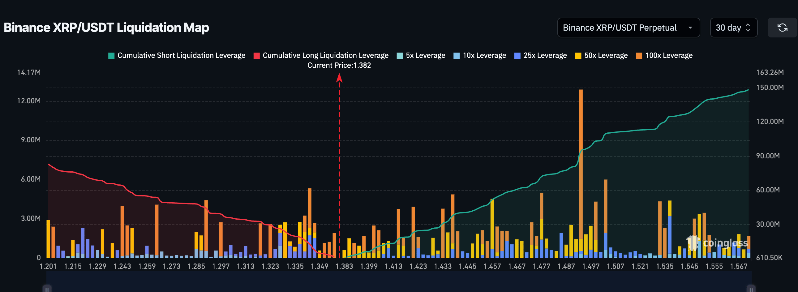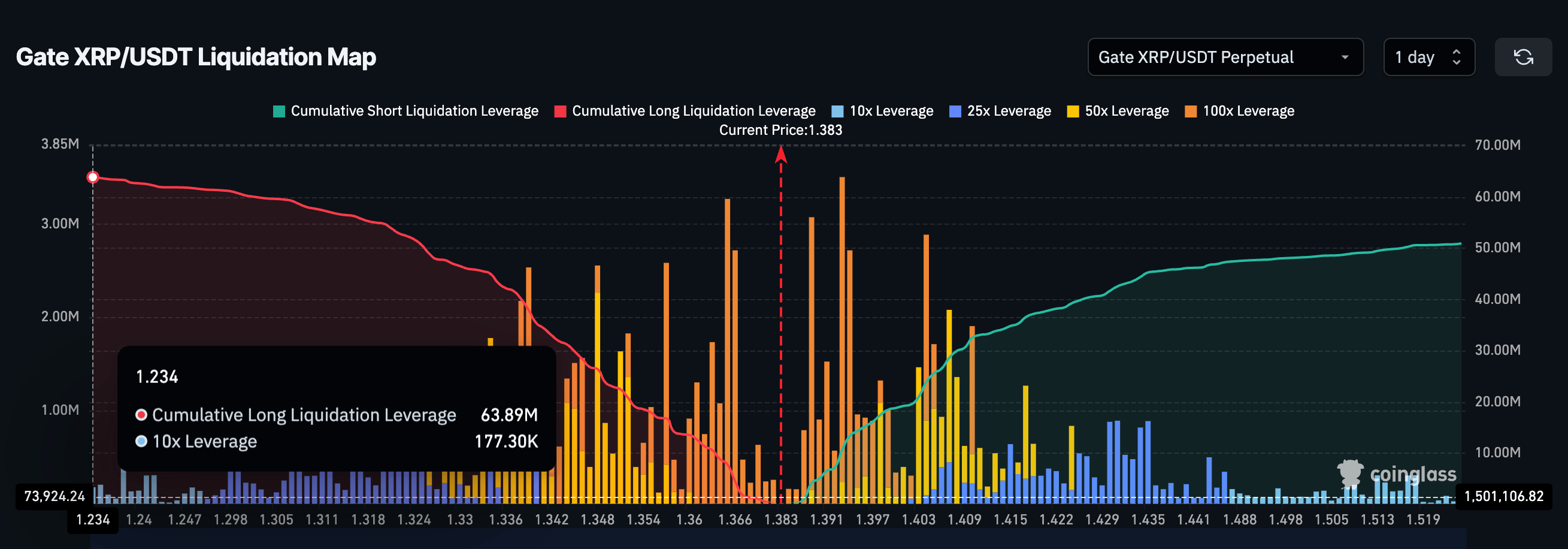 Dies ist auch der Bereich mit den meisten Long-Positionen, die leicht liquidiert werden können. Wenn XRP unter 1,34 USD schließt, besteht eine hohe Wahrscheinlichkeit für einen Ausverkauf, und die Erholungsphase könnte nicht mehr wirksam sein. In diesem Fall könnte der Preis auf 1,12 USD fallen. Umgekehrt ist die Marke von 1,50 USD ein wichtiger Widerstand.