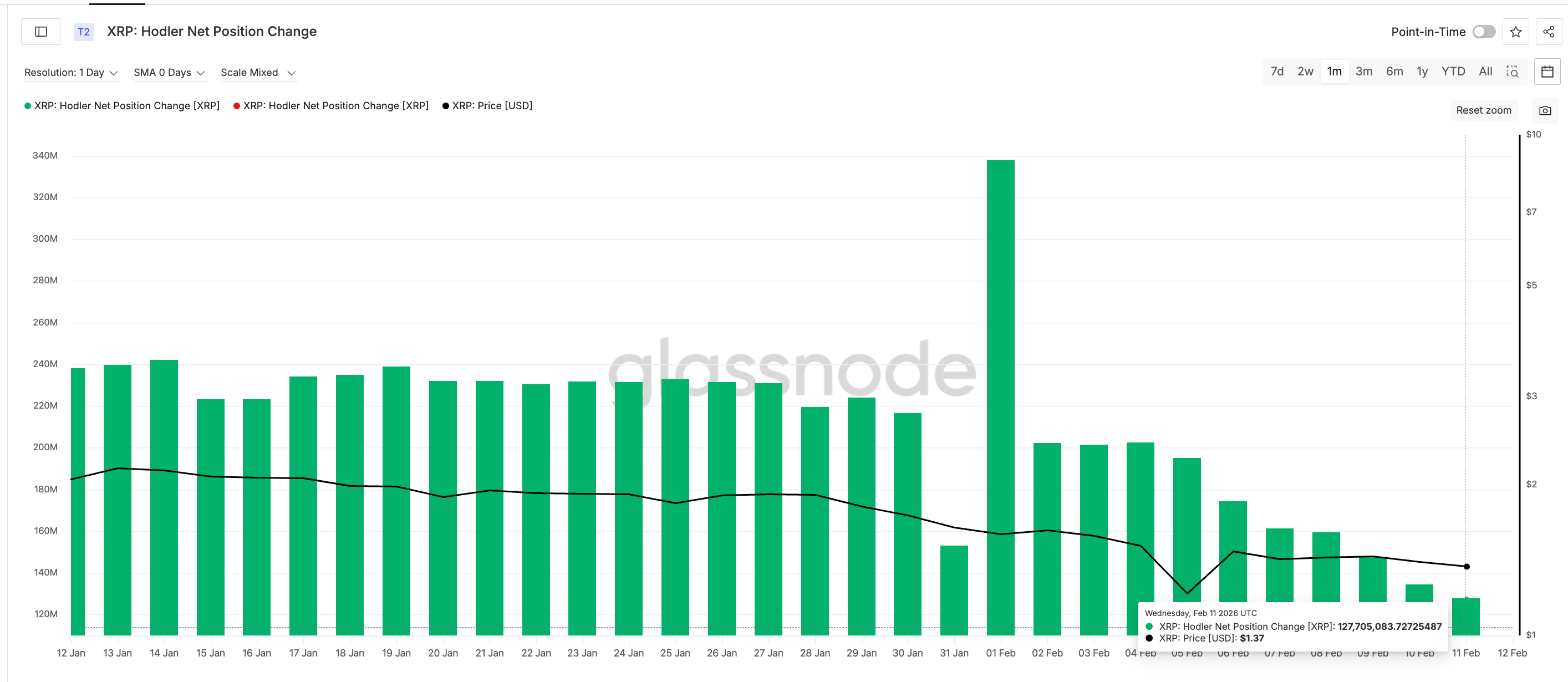 Am 08.02. verzeichnete XRP einen Nettobetrag von etwa 107 Millionen Tokens. Bis zum 11.02. war der Nettobetrag nur noch etwa 16 Millionen Tokens.