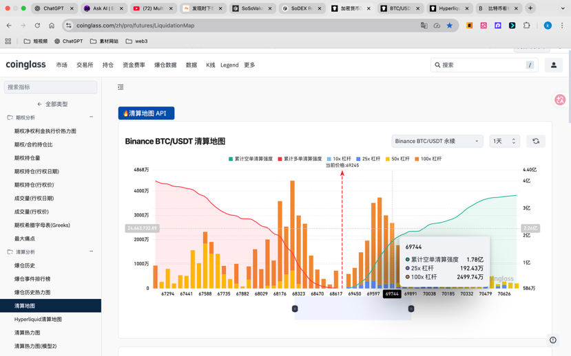 上方 69,700–70,000 之间,累计空单清算强度 1.78 亿,层层叠垒如拒马。