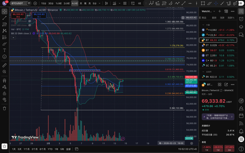 斐波那契帅旗高悬:0.5 关隘 69,700,恰是今夜多空必争之地。