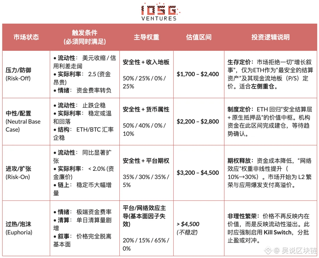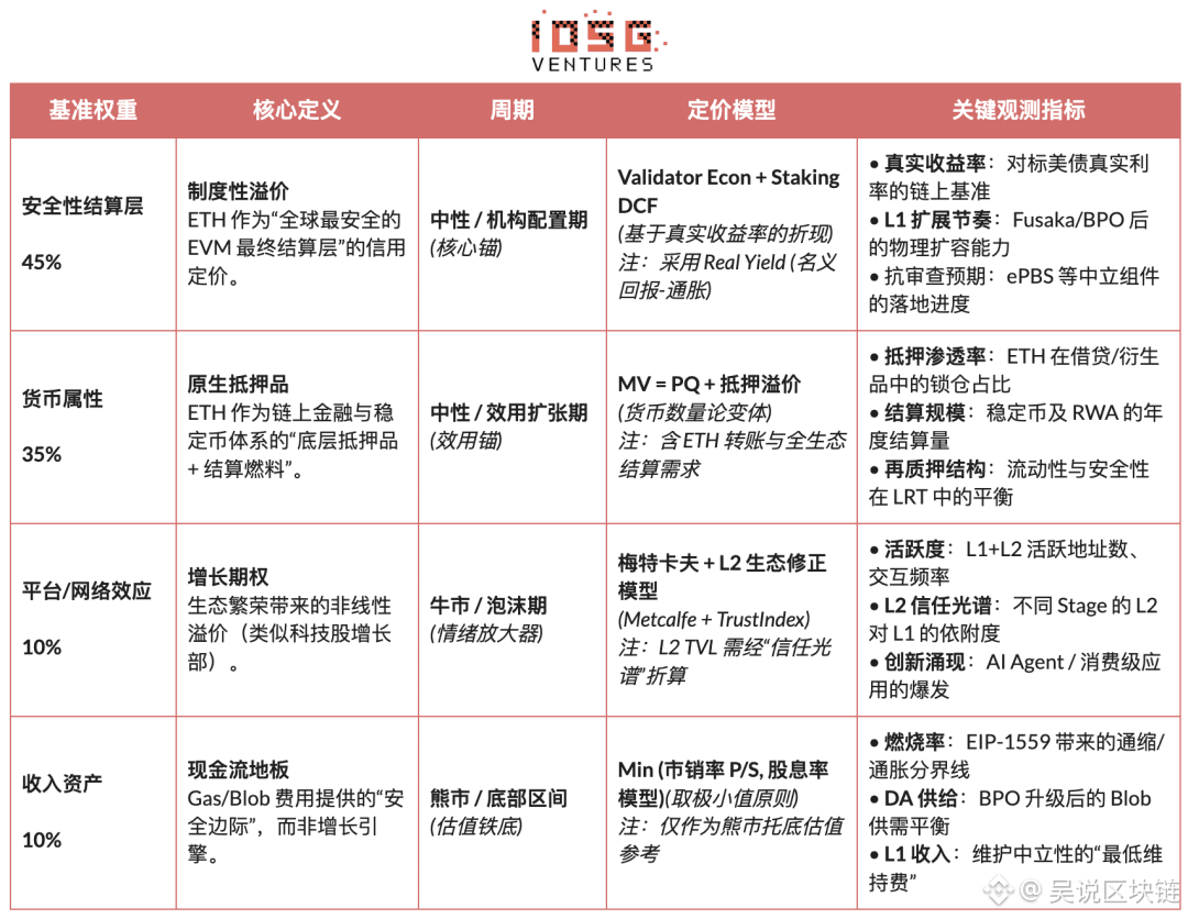 · 估值框架发生结构性迁移: 安全性与机构可信度权重显著上升,手续费与平台效应权重下降,ETH 的定价正从现金流模型转向资产溢价模型。