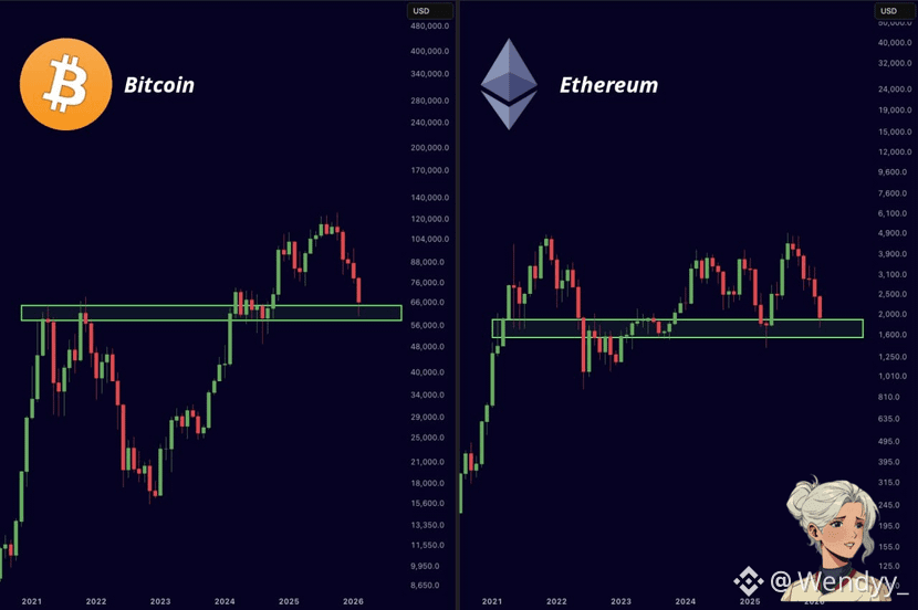 Bitcoin and Ethereum are both sitting directly on major higher-timeframe support zones â levels that previously acted as launchpads for explosive rallies. Historically, when price revisits these demand areas after a strong cycle, volatility doesnât stay quiet for long.