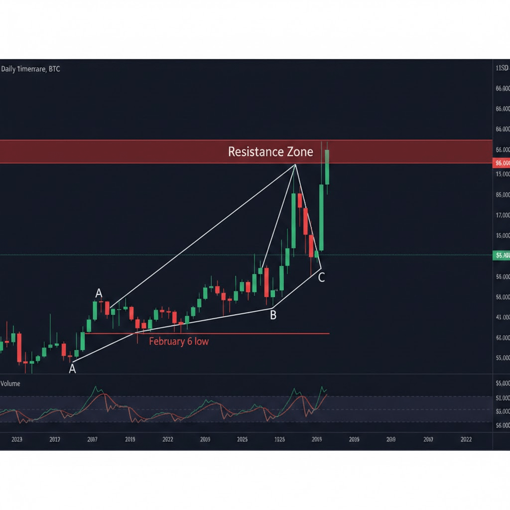 The bounce from the February 6 low currently resembles a corrective three-wave move, not a strong five-wave impulse. In Elliott Wave terms, that suggests the recovery might still be part of a broader correction not the start of a powerful new trend.