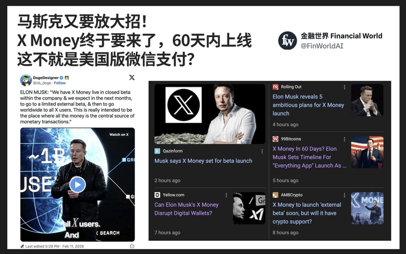 X Money 已进入内部测试阶段,预计在约 30-60 天内推出外部 beta 版本(目标约 3–4 月份上线)。