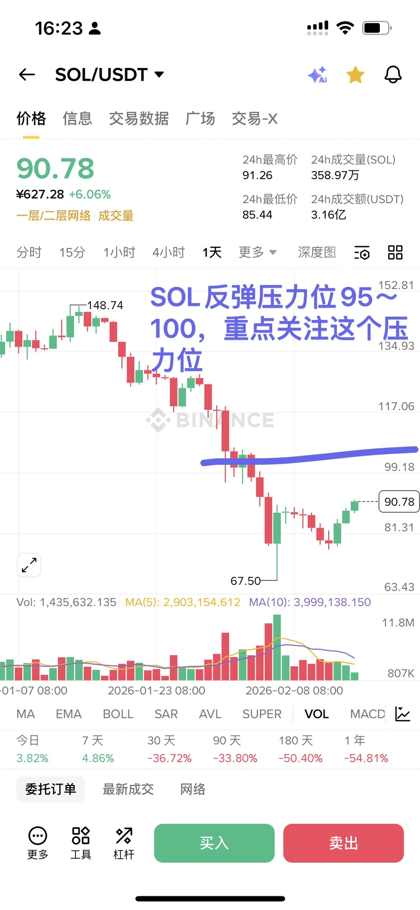 SOL hat sich in dieser Welle wirklich gut geschlagen. In meinem Artikel von gestern habe ich bereits erwähnt, dass SOL einen Nachholbedarf hat, das Ziel für die Rallye liegt bei 95–100. Der Markt bewegt sich im Großen und Ganzen wie von uns erwartet, und es genügt, die Gewinne in mehreren Schritten entsprechend den Zielmarken zu realisieren.