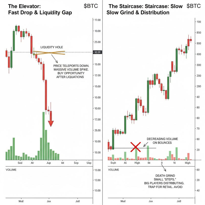 • The Elevator → Fast, vertical drop (liquidity gap).