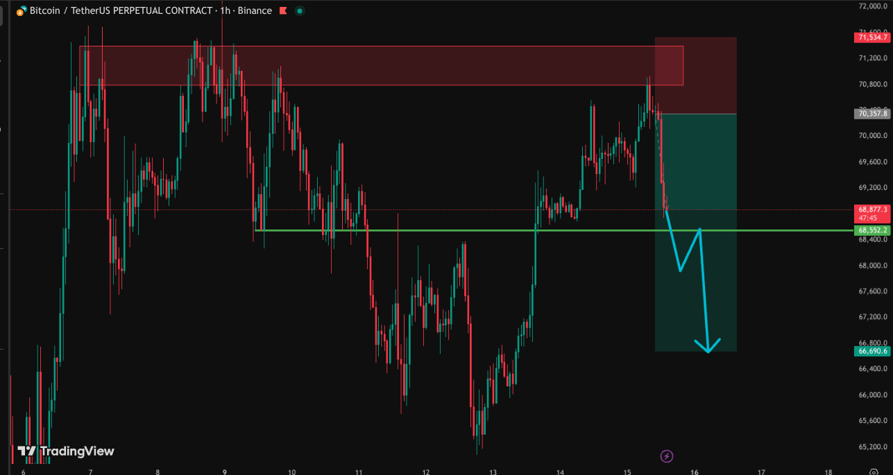 Recently, Bitcoin reached the $70,000 region and tapped a key supply zone on the 1-hour timeframe. This area previously acted as resistance, meaning sellers were likely waiting there to take profits or open short positions.